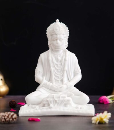 White Marble Lord Hanuman Sitting Statue with gada & Reading Book Decorative Showpiece