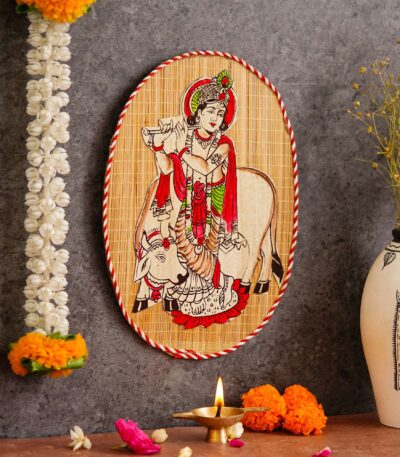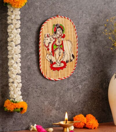 Oval Shaped Design Bamboo Hand Crafted Wall Hangings Of Krishna Ji With Holy Cow For Home D?cor | Bamboo Art For Wall Decor